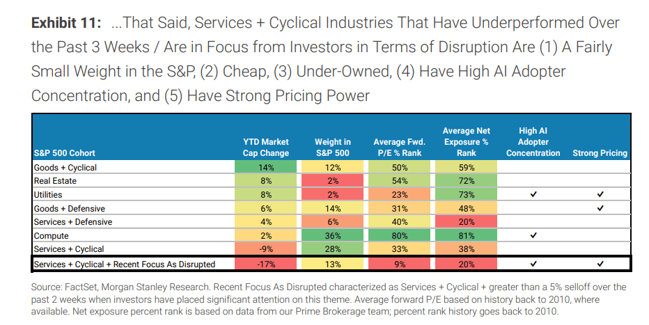 市场担心,跟着生成式AI(GenAI)和AI代办署理(Agentic AI)的兴起,很多保守的“办事+周期”型企业——特别是软件、消息办事和金融中介——将被完全。这种发急导致相关板块无不同抛售。2月25日,摩根士丹利美国股票策略取从题团队发布研报指出,近期美股市场对“AI论”反映过度了。起首,正在暴跌之后,这一被视为“标的”的群体目前仅占标普500总市值的13%。这一比例注释了为什么近期大盘指数全体回撤无限,但板块内部却。其次,这一群体的估值和拥堵度曾经处于极低程度。按照大摩的数据,目前“办事+周期”板块的相对估值处于2010年以来的第9百分位,几乎是汗青最廉价区间。而机构的净敞口也降至汗青第20百分位程度,处于极端低配形态。现实上,这些被抛售的群体,反而是大摩从题团队AI映照阐发中,AI采用率最高、订价权最强(位居前三分之一)的群体。市场眼中的“者”,这些跌幅惨沉的群体,恰好具有极高的AI采用者集中度。