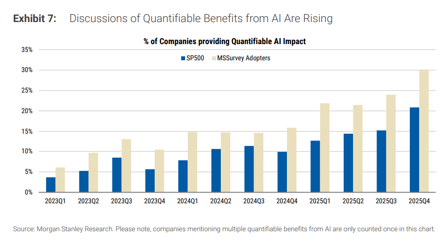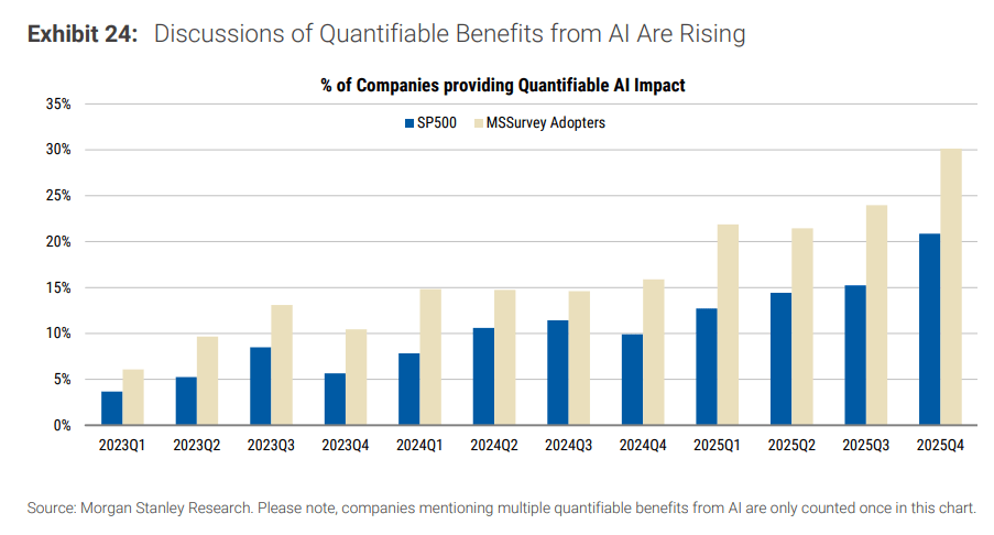 大摩团队操纵AI模子阐发了跨越10,000份财报和会议记实。成果显示,企业正正在获得本色性的AI盈利,且动能正正在持续加强。正在刚过去的2025年第四时度,被阐发师认定为“AI采用者”的公司中,有30%正在德律风会中提及了AI带来的至多一项“可量化的财政影响”。这一比例正在3Q25是24%,正在4Q24仅为16%。对于更普遍的标普500指数成分股,这一比例也升至21%。大摩对此婉言:“目前提及最多的量化收益次要集中正在‘财政影响’(包罗收入增加、成本节约),这部门的提及量比上季度翻了一倍。”反映到根基面上,其远期净利润率预期不只没有被,反而正正在加快扩张。