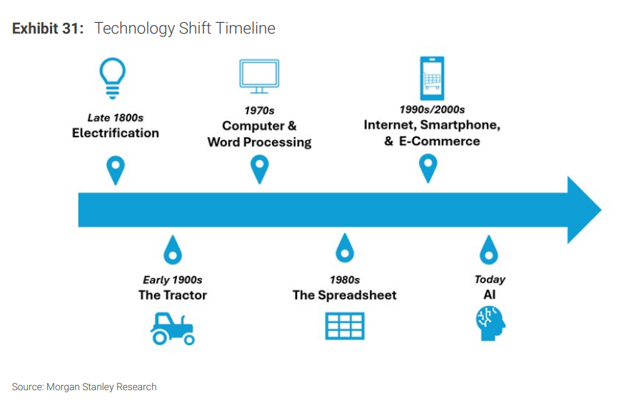 贯穿所有“AI论”的终极担心,是AI会导致白领阶级大规模赋闲,进而激发经济阑珊和消费降级。大摩通过回首过去150年的手艺变化(电气化、拖沓机、计较机、互联网)指出,汗青证明,每一次严沉手艺立异城市深刻改变劳动力布局,但“并未代替劳动力”。相反,手艺会创制全新的工做岗亭。大摩估计,跟着AI的深切使用,企业不只需要“首席AI官”,还会催生如“产物司理-工程师夹杂体”、“AI供应链预测员”、“计较遗传学家”等全新职业。总而言之,新手艺的席卷确实带来了旧次序的阵痛。但正在市场因盲目发急而错杀大量优良资产时,回归贸易素质——紧盯企业专属数据、物理资产壁垒及远期盈利能力,才是穿越手艺周期的最优解。