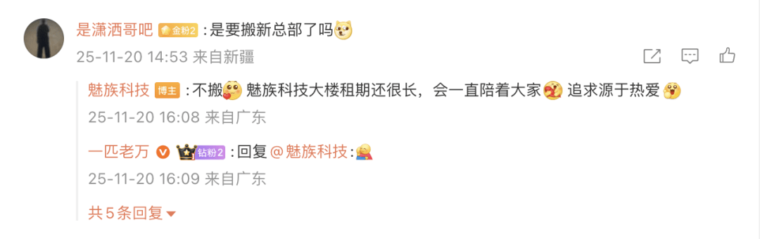 对此,有网友扣问魅族科技官微:要搬新总部吗?魅族方面则答复称:「魅族科技大楼租期还很长,会一曲陪着大师,逃求源于热爱。」魅族近年来正在手机营业上逐步失势。2017 年后,跟着创始人黄章回合并砍掉魅蓝品牌,线下渠道缩减,市场份额持续下滑。2022 年 7 月,吉利通过星纪时代收购魅族 79。09% 股权,至 2023 岁尾实现 100% 控股,黄章完全退出。2023 年 3 月,星纪魅族集团成立,总部设正在武汉,珠海仅为四大办公地址之一,地位不再焦点。本年 3 月有动静称,星纪魅族启动组织架构调整,市场部全体迁至深圳办公,未随迁员工需选择去职。业内人士指出,此举是因「珠海跟不上大,公司需要找个新的按照地,对标大疆、华为等深圳企业」。目前,魅族营业沉心已转向 FlymeAuto、智能眼镜等取吉利汽车深度协同的标的目的,手机营业存正在感极低,9 月,魅族 22 正在跳票两次之后终究发布,但并未搭载旗舰芯片。
